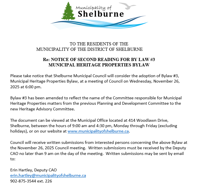 Please take notice that Shelburne Municipal Council will consider the adoption of Bylaw #3, Municipal Heritage Properties Bylaw, at a meeting of Council on Wednesday, November 26, 2025 at 6:00pm.