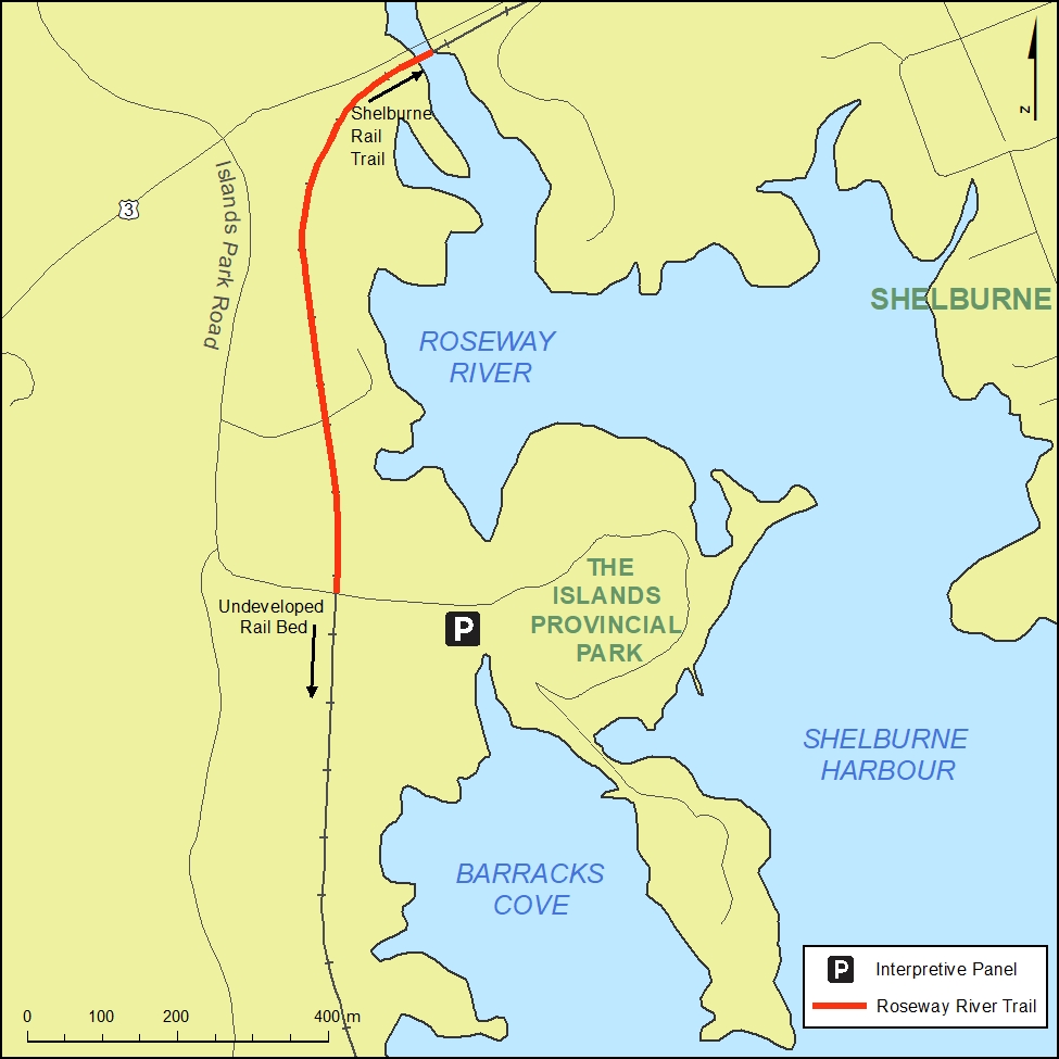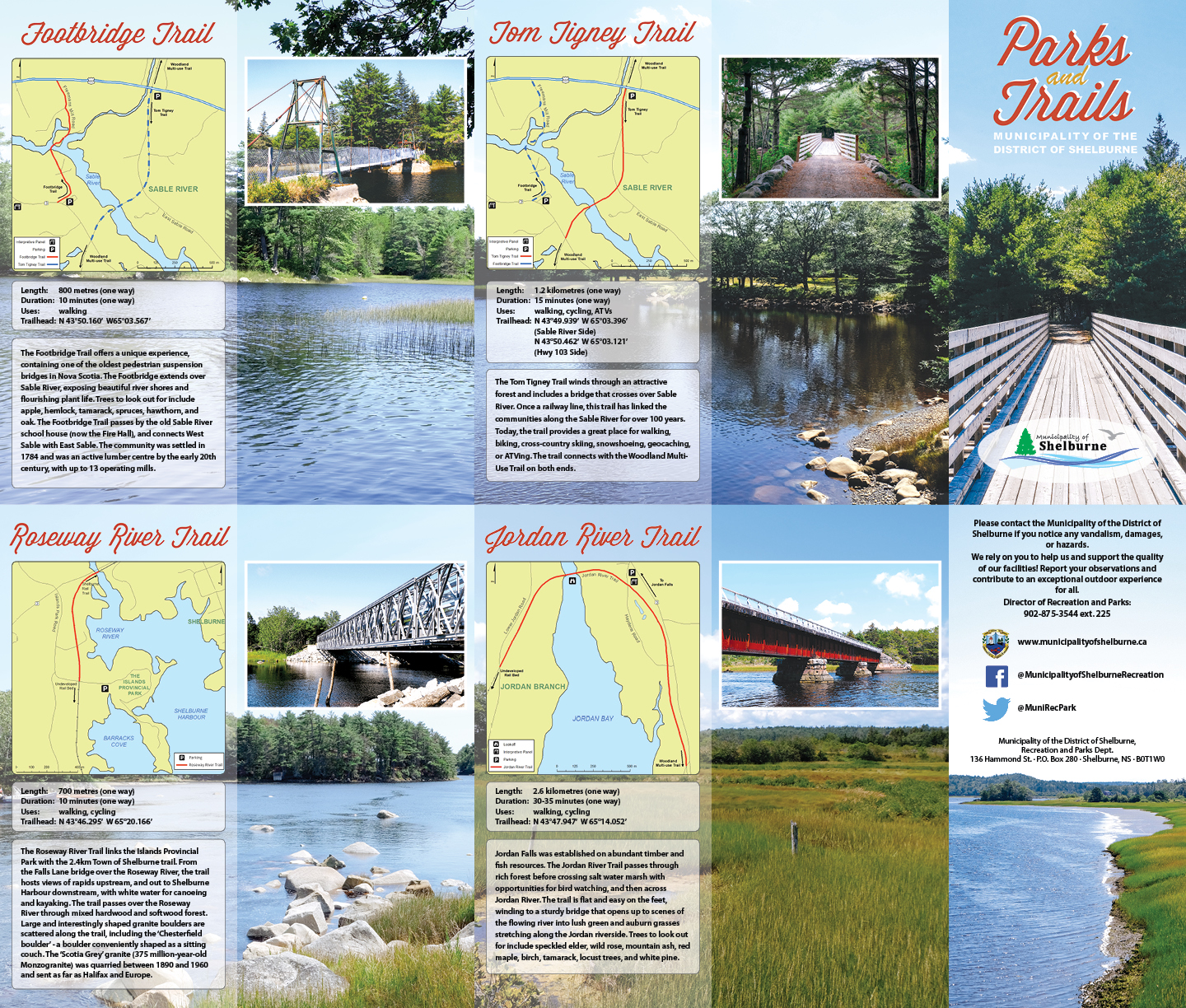 The Roseway River Trail (approx. 1 km) begins at McGill Point Lane and crosses the Roseway River via two bridges. It follows the former railway bed and ends at the road near the entrance to the Islands Provincial Park. Motorized use is not allowed along the Roseway River Trail. The Roseway River Trail connects to the Town of Shelburne’s Rail Trail (3.5km) at McGill Point Lane.