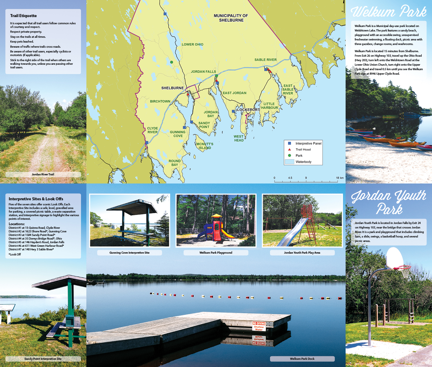 The Jordan River Trail (approx. 2.6 km) is located in the Jordan Falls community. To get to the trail head from the 103 hwy take exit #24 along #3 hwy from Jordan Falls to Lockeport. Turn right onto Hayden’s Road. The Trail head is located in a small parking area beside Hayden’s Road. From the trail head you can walk along the trail to the left to end near Camp Jordan or to the right to go across the Jordan River. The former CN bridge has a fenced board walk along it, you walk beside salt water marshes to the trail end where it meets the Lower Jordan Road. Motorized use is allowed along the Jordan River Trail.