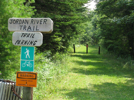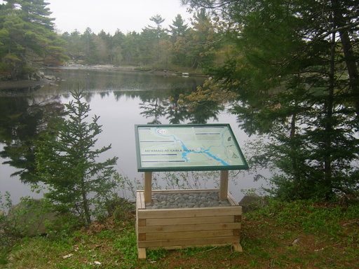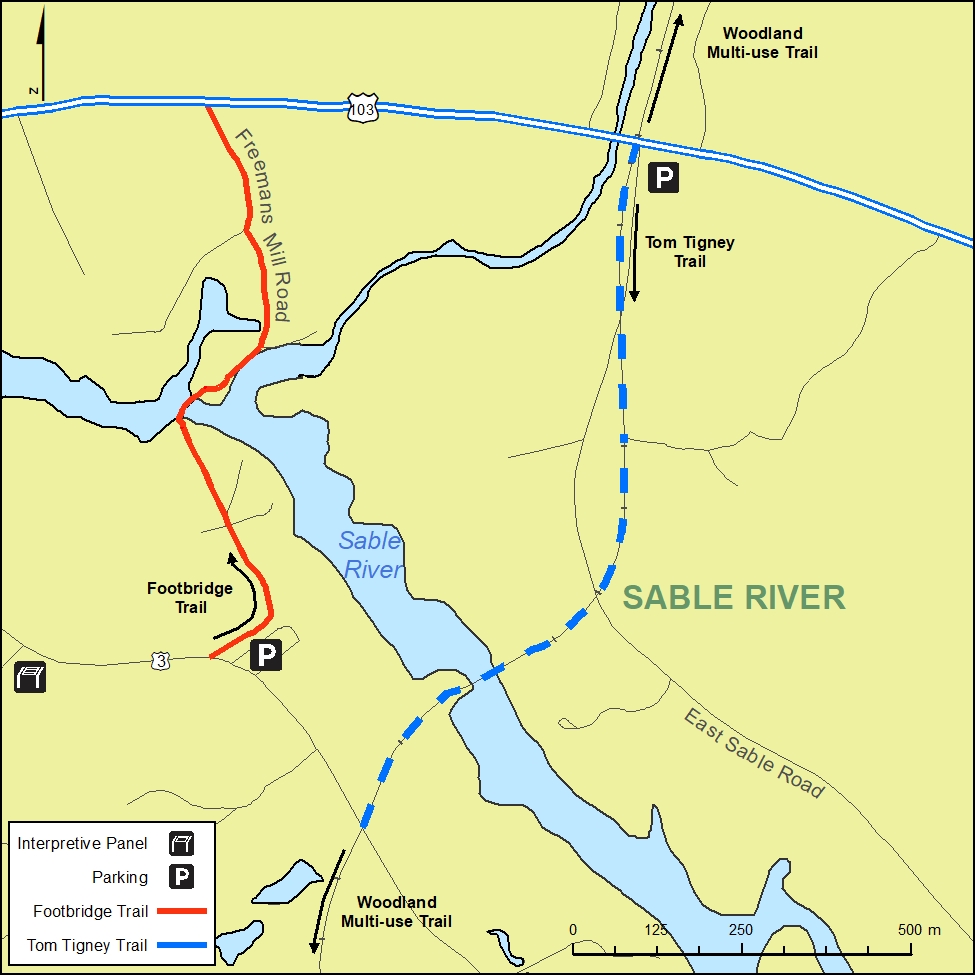 The Tom Tigney Trail (approx. 1.2 km) head is opposite the Chef’s Plate Restaurant beside the river and is a multi-use trail. A picnic table has been placed there for users to sit at and eat or take a rest to listen and watch the waters of the Tom Tigney River. The trail crosses the East Sable Road twice and about 3/4 of the way along it is a former CN bridge that now has a fenced board walk. On a warm, sunny day the view from the bridge up and down the Sable River is spectacular. This trail ends where the trail meets the old highway #3. Motorized use is allowed on the trail.